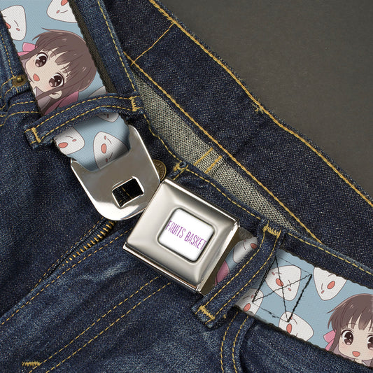 FRUITS BASKET Title Logo Full Color White/Purple Seatbelt Belt - Fruits Basket Chibi Tohru Honda and Rice Ball Scattered Light Blue Webbing