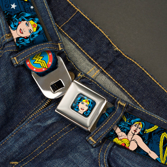 Wonder Woman Face Comic Full Color Blues Seatbelt Belt - Wonder Woman Face/Poses/Logos/Comic Scenes Blues/Yellow Webbing
