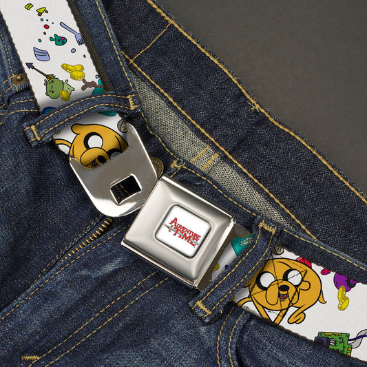 ADVENTURE TIME Title Logo Full Color White Seatbelt Belt - Adventure Time Jake and Finn Open Pack Pose White Webbing