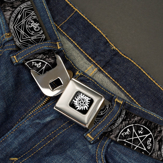 Winchester Logo Full Color Black White Seatbelt Belt - Supernatural Devil's Trap Pentagrams Grays/Black/White Webbing